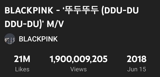 Vượt qua hàng loạt nhóm nhạc lớn khác, BLACKPINK ghi danh vào lịch sử của nền âm nhạc idol xứ kim chi, bỏ xa những kỷ lục từng được xác lập trước đó. Cụ thể vào 4 giờ sáng ngày 3 tháng 7 (theo giờ Hàn Quốc), video âm nhạc cho ca khúc DDU-DU DDU-DU (2018) đã vượt qua cột mốc 1,9 tỷ lượt xem trên YouTube. Nhờ đó, tác phẩm này trở thành MV âm nhạc đầu tiên của K-pop đạt được con số đáng ngưỡng mộ này.