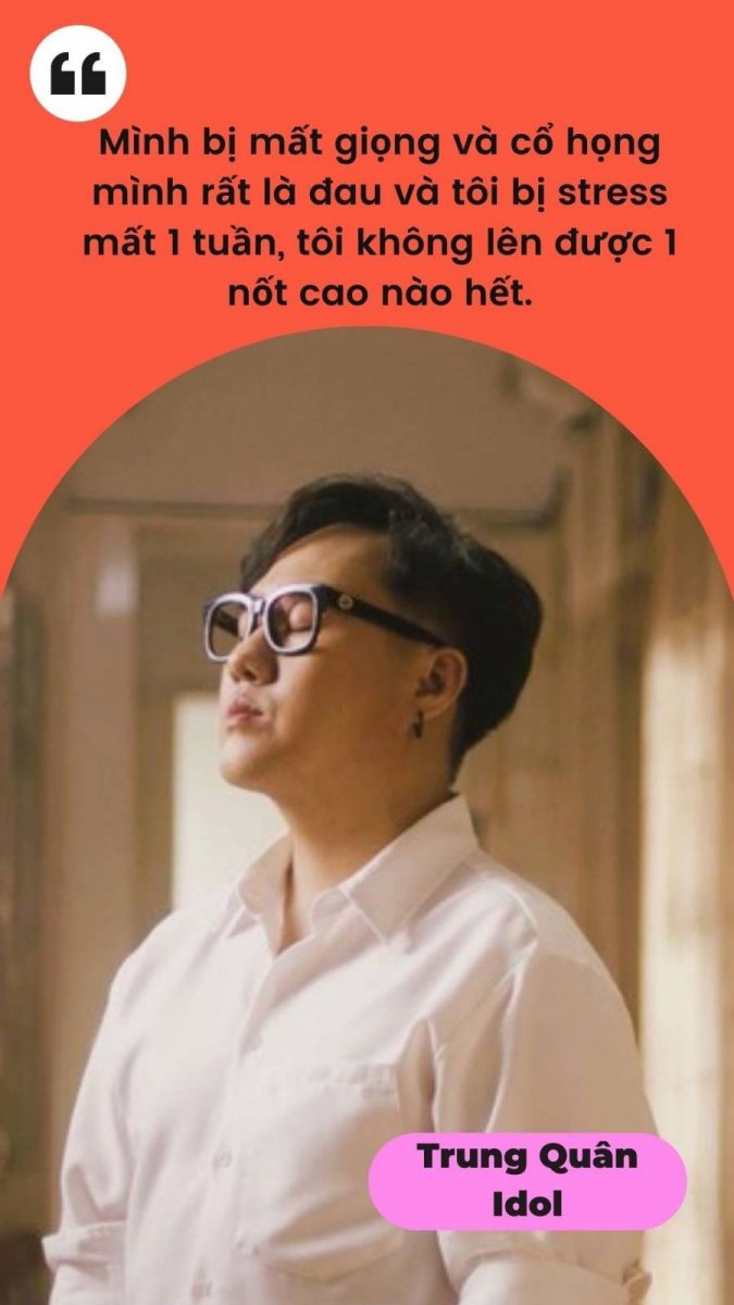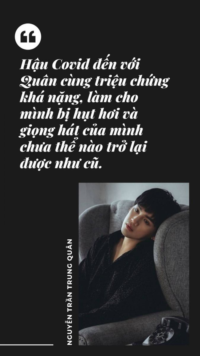 Do Quân bị xoang nữa nên đau họng kết hợp với Covid thì mình bị mất giọng và cổ họng mình rất là đau và tôi bị stress mất 1 tuần, tôi không lên được 1 nốt cao nào hết. Tôi lo, nhiều khi suy nghĩ có khi nào hậu Covid mình không hát được nốt cao nữa không. Rất may sau khi uống thuốc đầy đủ và khỏe lại thì may mắn là mình vẫn hát tốt. Đến lúc này, tôi chỉ cảm thấy là khó ngủ và dễ mệt mỏi hơn ngày xưa!'.