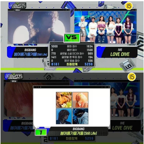 Được gọi là duyên nợ với nhau bởi vì mới hôm trước IVE trở thành 'kẻ phá bĩnh' khi đã ngáng đường việc đạt PAK của đàn anh, thì ngay sau đó BIGBANG đã đáp trả bằng việc có chiến thắng áp đảo tại một show âm nhạc. Trong chương trình Mcountdown được tổ chức ngày 14/4, với siêu phẩm Still Life, BIGBANG đã đem về chiếc cúp danh dự. Nhóm đã dành được chiến thắng áp đảo trước IVE nhờ vào điểm digital cực đỉnh 5000 điểm dù hai hạng mục điểm bán album và điểm sân khấu trình diễn của nhóm chỉ đạt con số 0. Điều đặc biệt điểm số do fan vote cho nhóm BIGBANG cao hơn đàn em tới 7 lần.