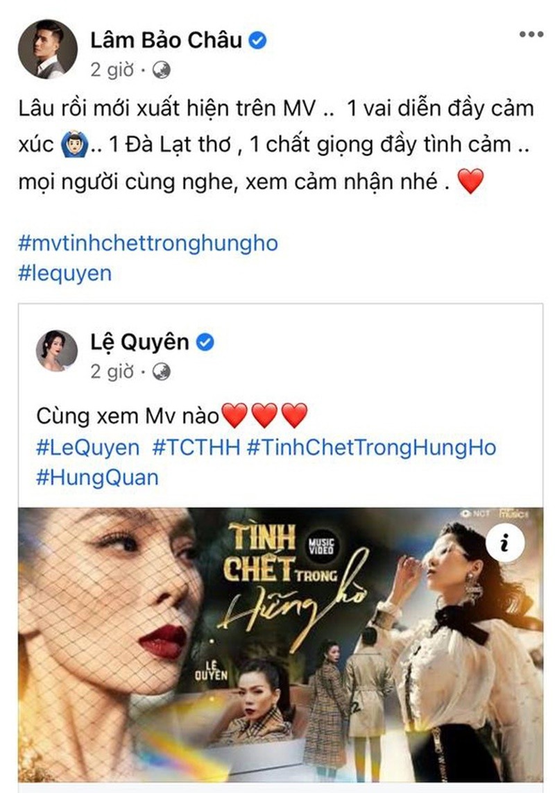 Về phía chàng, Lâm Bảo Châu cũng không ngần ngại chia sẻ trải nghiệm thú vị khi được xuất hiện trong MV Tình chết trong hững hờ của bạn gái. Anh viết trên trang cá nhân: Lâu rồi mới xuất hiện trên MV, 1 vai diễn đầy cảm xúc… 1 Đà Lạt thơ, 1 chất giọng đầy tình cảm…