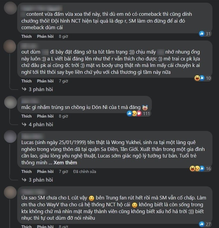 'Sao còn chưa chịu rời nhóm vậy trời?', 'Vừa đấm vừa xoa thế này, thì dù em nó có comeback cũng dính chưởng thôi! Đội hình NCT hiện tại quá là đẹp rồi, SM làm ơn đừng để ai đó comeback','Mới đọc thông tin SM Entertainment cho hoạt động trở lại hôm qua thì hôm nay lên bài, ghê thiệt',... netizen để lại loạt bình luận công kích trước sự trở lại của Lucas.