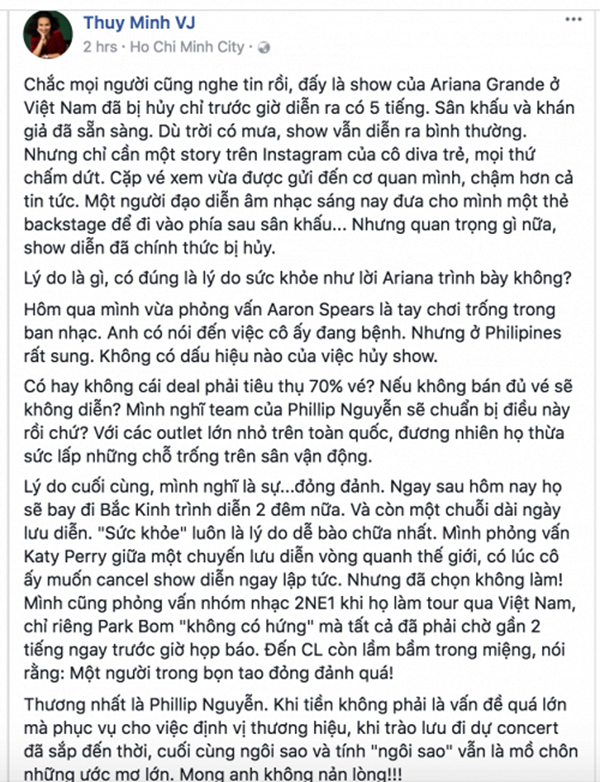 Theo Thuỳ Minh, nguyên nhân huỷ show là vì vấn đề sức khoẻ lại không hợp lí vì cô từng liên hệ với tay chơi trống Aaron Spears trong ban nhạc và được biết, tình trạng của Ariana Grande trong đêm diễn trước đó tại Phillipines là hoàn toàn bình thường, không có dấu hiệu gì bất ổn. Bên cạnh đó, là một người từng phỏng vấn trực tiếp với nhiều sao ngoại quốc khác như Katy Perry, 2NE1, nữ MC này cho rằng vấn đề ở Ariana chính là sự đỏng đảnh và bệnh ngôi sao.