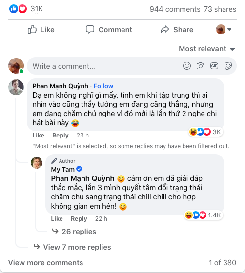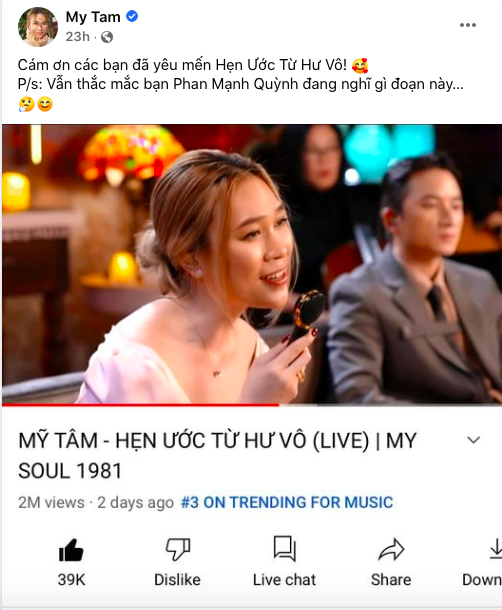 Tuy nhiên, dưới câu chia sẻ này, Mỹ Tâm viết thêm: 'Vẫn thắc mắc bạn Phan Mạnh Quỳnh đang nghĩ gì đoạn này'.