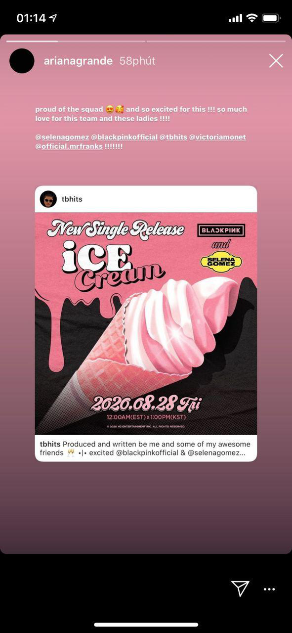 Cụ thể, trên trang Instagram của chính Ariana Grande, cô đã lên tiếng xác nhận về thông tin trên bằng đoạn story được đăng cách đây ít phút đính kèm với poster ca khúc Ice Cream: "Tự hào về đội này ghê, thực sự rất hào hứng cho sản phẩm này! Yêu team này với những cô gái này thật nhiều!"
