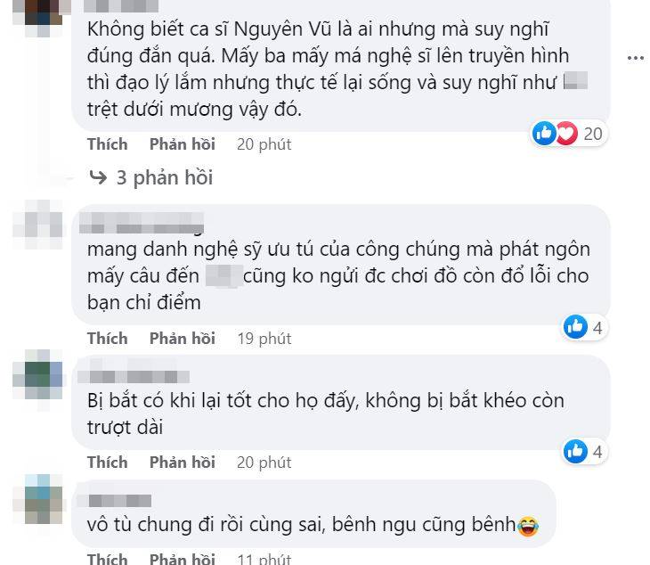 Ca sĩ Nguyên Vũ bức xúc lên tiếng: “Im lặng đôi khi cũng là một dạng thương mến lo lắng, buồn giận không có nghĩa lúc nào cũng phải la lên cho người ta thấy và biết được cảm xúc của mình. Giúp đỡ nhau trong cơn khốn khó, chia sẻ những yêu thương trong hoàn cảnh khổ cực nhưng sai là sai. Đôi khi phải thấy cái sai của bạn mình của em mình của cháu mình cũng là cái sai của mình, đừng vì tình thương thân thiết mà để người khác nhìn vào thành bao biện chống chế cho nhau”.