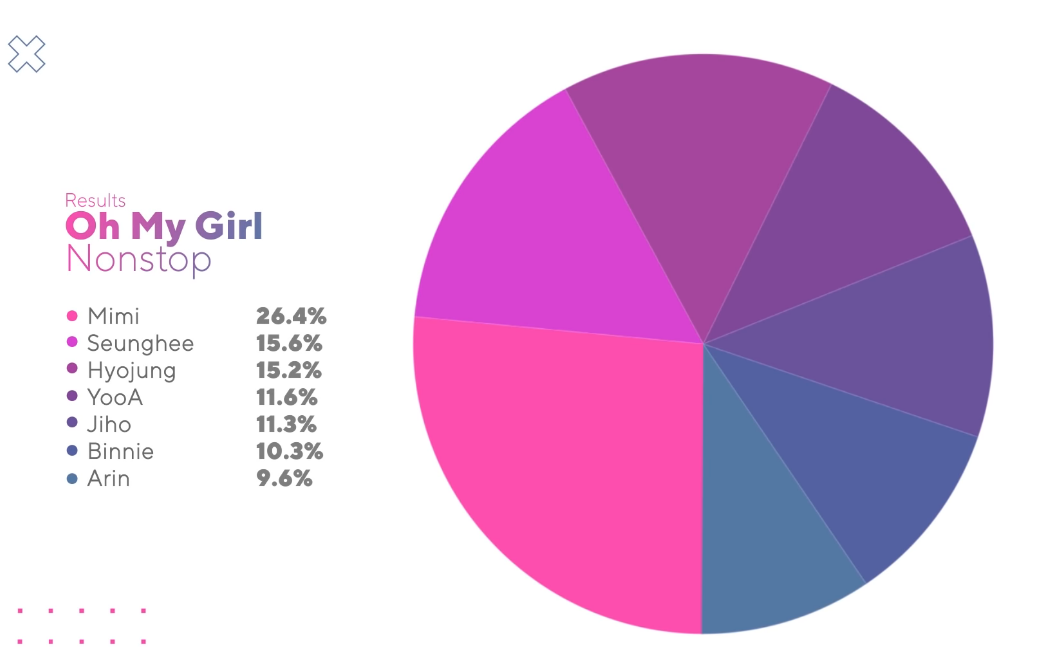 Cụ thể là Mimi góp giọng nhiều nhất trong ca khúc (26,4%) dù chỉ đóng vai trò main dancer trong nhóm. Trong khi đó, 2 main vocal Seunghee và Hyojung có thời lượng hát lần lượt là 15,6% và 15,2% cho cả bài, nghĩa là chỉ bằng khoảng một nửa so với thành viên hát nhiều nhất.
