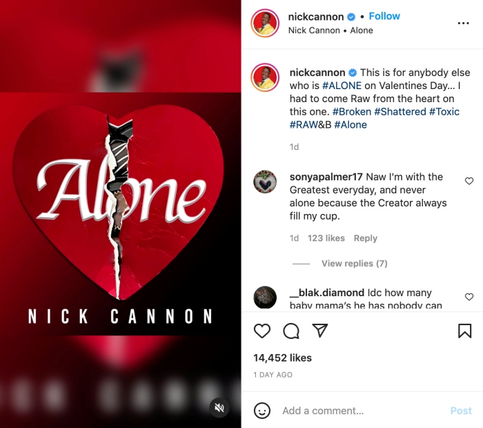 Trên trang cá nhân, Nick Cannon giới thiệu về bản nhạc vừa trình làng như sau: ” Ca khúc này dành cho những ai đang cô đơn vào ngày Valentine. Tôi đã mang tất cả sự chân thành của mình vào từng lời hát“. Bài đăng còn được đính kèm các hashtag “tổn thương”, “tan vỡ”, “độc hại”, “một mình” dường như để miêu tả về mối tình cũ. Tuy nhiên, đó chưa phải là tất cả những gì có thể bàn luận về “Alone”.