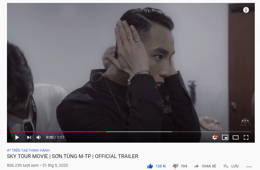 Đoạn trailer cho Sky Tour sau hơn 12 tiếng ra mắt đã vươn thẳng lên top 7 trending với hơn 800 nghìn lượt xem và hơn 120 nghìn lượt thích. Với tốc độ và phong độ như hiện tại, có vẻ như Sơn Tùng hoàn toàn có thể thống trị top trending YouTube Việt Nam chỉ với một đoạn đoạn trailer giới thiệu một bộ phim tài liệu chiếu rạp. Nếu chạm đến #1 tab thịnh hành, trailer Sky Tour chính là đoạn trailer phim đầu tiên vươn đến vị trí Quán quân top trending tại Việt Nam và Sky chắc chắn sẽ cố gắng để điều đó xảy ra!