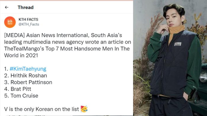 Trước đó vài ngày, nam thần tượng sinh năm 1995 cũng đứng đầu danh sách 7 người đẹp trai nhất thế giới năm 2021 do hãng thông tấn hàng đầu Ấn Độ - Asian News International công bố. Theo danh sách của hãng này, nam thần tượng nhóm BTS thậm chí đã vượt qua cả những tên tuổi đình đám như Hrithik Roshan, Robert Pattinson, Brad Pitt và Tom Cruise để giành ngôi đầu.