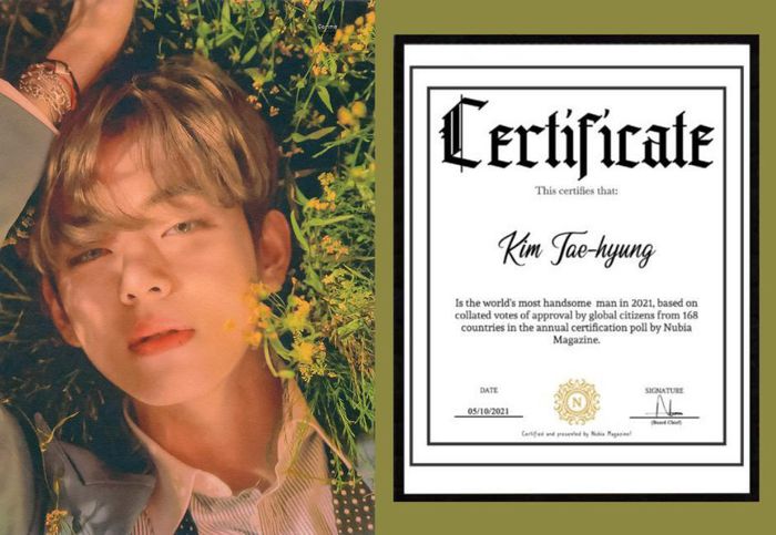 Chứng nhận "Người đàn ông đẹp trai nhất thế giới" được trao cho V.