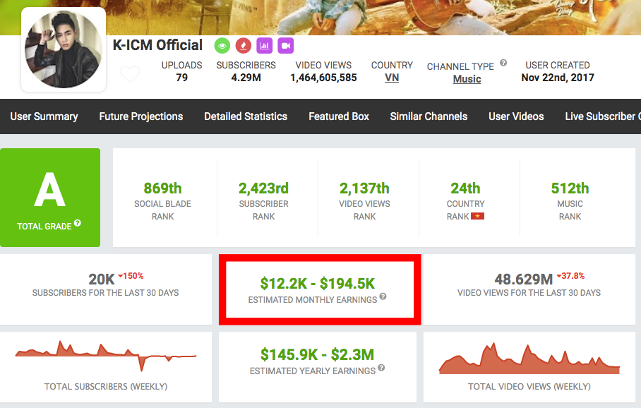 Theo đó, trang này ước tính với các chỉ số hiện tại bao gồm cả lượt view và lượt subscribes (theo dõi), kênh Youtube của Jack mang tên J97 có thể mang về lợi nhuận từ 11 nghìn đến 175,8 nghìn USD (khoảng hơn 3,5 tỷ VNĐ mỗi tháng). Còn về phía K-ICM, nam producer có thể đạt lợi nhuận nhiều hơn tương đối so với Jack khi sở hữu 12,2 nghìn đến 194,5 nghìn USD (khoảng hơn 3,88 tỷ VNĐ mỗi tháng).