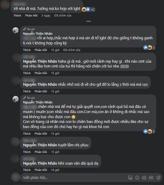 Cụ thể, trên trang Facebook cá nhân của Thiện Nhân, một người hâm mộ đã để lại bình luận khuyên nữ ca sĩ nên quay lại với gia đình rằng: “Về nhà đi má. Tướng má không hợp làm LGBT”. Thay vì lịch sự đáp trả, nữ ca sĩ còn “hùa theo”, thoải mái xưng “má – con” với vị fan này.