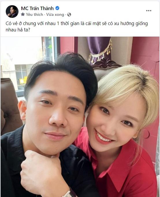 Giữa thời điểm nóng, anh vui vẻ đăng ảnh “tình bể bình” bên bà xã Hari Won. “Có vẻ ở chung với nhau một thời gian là cái mặt sẽ có xu hướng giống nhau hả ta?”, Trấn Thành chia sẻ mới đây.