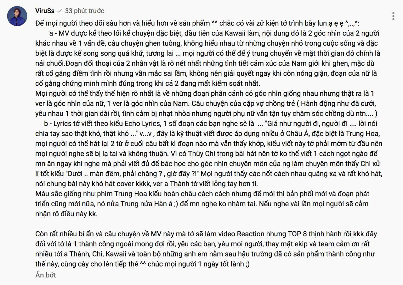 Theo đó, ViruSs đã dành phần 1 của bình luận để đứng ra giải thích về nội dung MV có phần khó hiểu được xây dựng bởi bộ đôi "tạo drama": đạo diễn Kawaii Tuấn Anh - biên kịch Minh Châu. Anh khẳng định, câu chuyện trong MV có phần rối do thể hiện 2 góc nhìn của 2 người khác nhau về 1 vấn đề. Hot streamer cũng lí giải một số chi tiết xuất hiện trong MV để bổ trợ cho lời giải thích của mình.