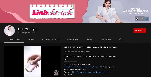 Vừa là một creators trên YouTube và cũng khá nổi tiếng ở TikTok, kênh Linh Chủ Tịch cũng là cái tên tiếp theo nhận nút vàng với 1,08 triệu người theo dõi và hơn 500 triệu lượt xem toàn kênh. Cô nàng rất chịu khó ra mắt nhiều video để có thể đáp ứng nhu cầu của khán giả.