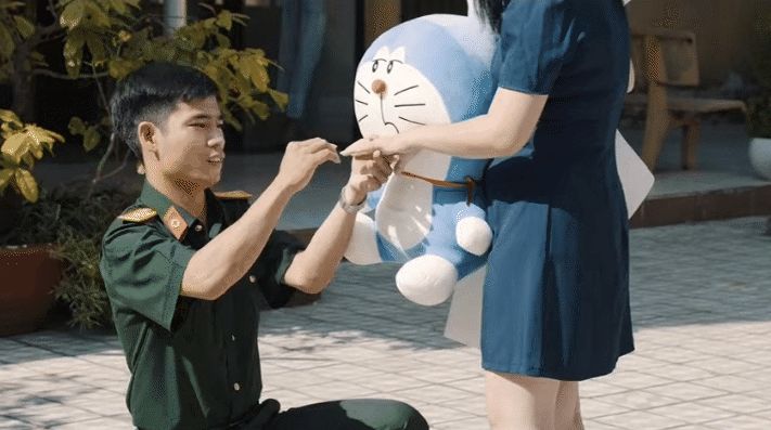 Để bắt đầu màn cầu hôn, nhân vật nam chính là anh bộ đội quân y đã nói trên loa: "Xin mời dược sĩ Nguyễn Ngọc Huy ra phía trước sân trường". Vì là sự chuẩn bị bí mật nên nữ dược sĩ không giấu được biểu cảm ngơ ngác xen lẫn hoang mang. Tuy nhiên khi nhận ra đây chính là màn cầu hôn của bạn trai, cô đã vỡ oà trong sự xúc động.